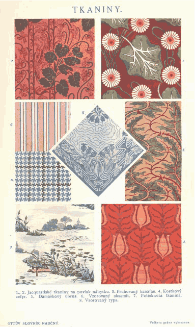 Tkalcovstvi [Weaving], Berousek. Ottuv Slovník Naucný [Scientific Dictionary], 1897, 5 pages. Posted August 12, 2003. SAMPLE PAGE. File size 680 KB PDF