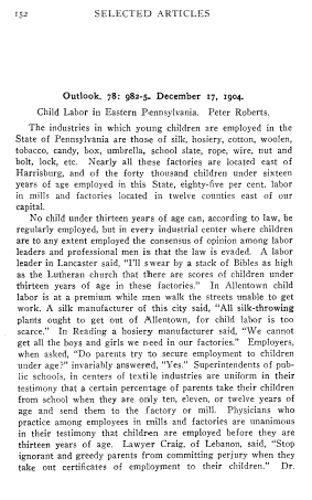 Child Labor in Eastern Pennsylvania, Roberts, Peter. Outlook, Vol. 78 (1904), 7 pages. Note: From "Selected Articles on Child Labor", Debater's Handbook Series, 1911. CD (HWDA07). Posted October 22, 2003. SAMPLE PAGE. File size 688 KB PDF