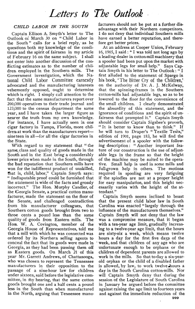 Child Labor in the South, ---. Outlook, Vol. 85 (1907), 8 pages. CD (HWDA09). Posted September 24, 2003. SAMPLE PAGE. File size 856 KB PDF