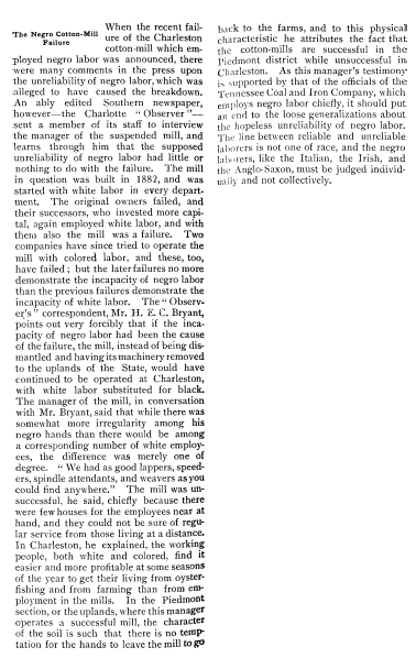 The Negro Cotton-Mill Failure, ---. Outlook, Vol. 67 (1901), 1 page. CD (HWDA09). Posted September 15, 2003. SAMPLE PAGE. File size 448 KB PDF