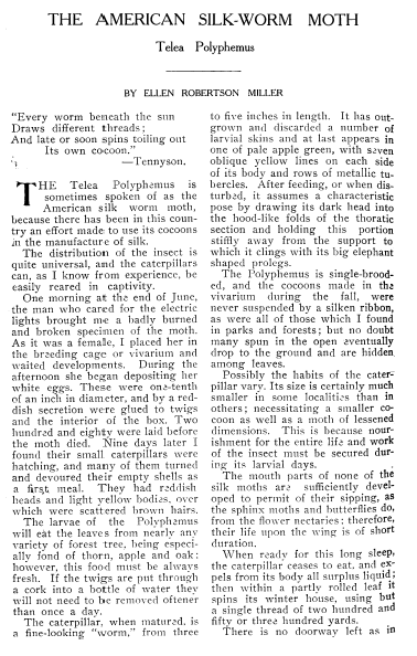 American Silk-Work Moth: Telea Polyphemus, Miller, Ellen Robertson. Overland, Vol. 43 (1904), 2 pages. CD (HWDA09). Posted September 23, 2003. SAMPLE PAGE. File size 508 KB PDF