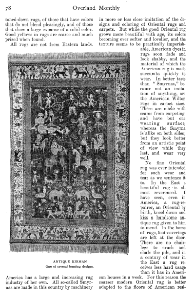 Fine Rugs, Sturgis, Dinah. Overland, Vol. 36 (1900), 9 pages. CD (HWDA09). Posted September 24, 2003. SAMPLE PAGE. File size 1.5 MB PDF