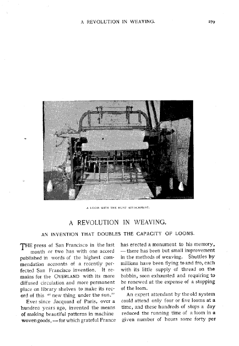 A Revolution in Weaving, Wilson, S. G. Overland, Vol. 28, No. 165 (September 1896), 3 pages. CD (HWDA12). Posted March 8, 2005. SAMPLE PAGE. File size 532 KB PDF