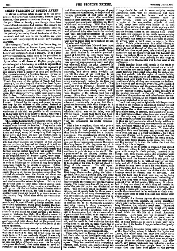 Sheep Farming in Buenos Ayres, ---. People's Friend, 1872, 2 pages. CD (HWDA09). Posted June 17, 2004. SAMPLE PAGE. File size 692 KB PDF