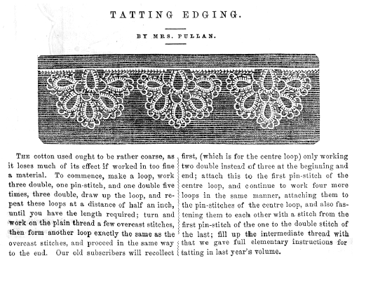 Tatting Edging, Pullan, Mrs. Peterson's Magazine, 1857, 1 page. Posted December 20, 2004. SAMPLE PAGE. File size 640 KB PDF