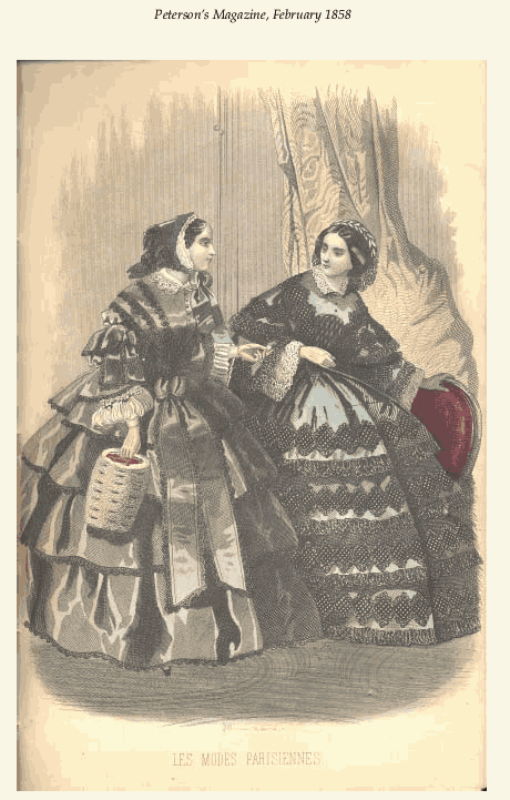 [costume and design pages], ---. Peterson's Magazine, Vol. 33, No. 12, December 1858, 10 pages. CD (LDA01). Posted November 6, 2002. SAMPLE PAGE. File size 2.7 MB PDF