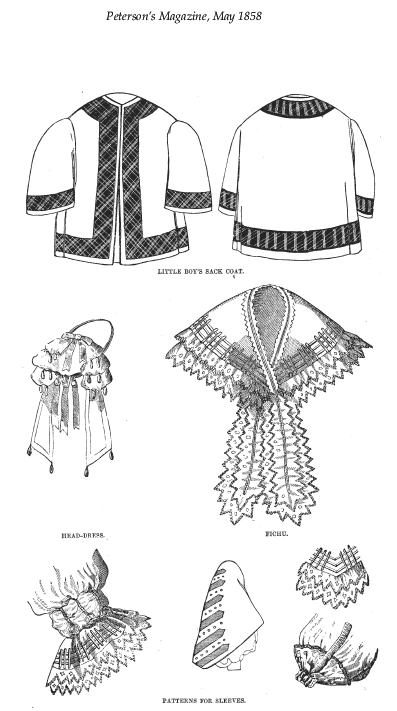 [costume and design pages], ---. Peterson's Magazine, Vol. 33, No. 5, May 1858, 7 pages. CD (LDA01). Posted November 6, 2002. SAMPLE PAGE. File size 3.6 MB PDF