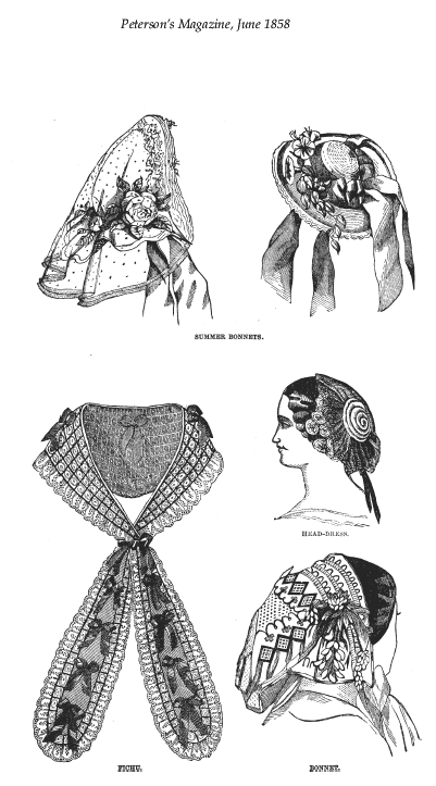[costume and design pages], ---. Peterson's Magazine, Vol. 33, No. 6, June 1858, 7 pages. CD (LDA01). Posted November 6, 2002. SAMPLE PAGE. File size 3.6 MB PDF