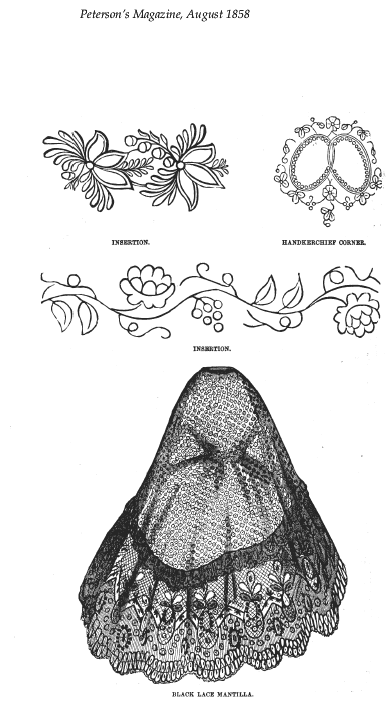 [costume and design pages], ---. Peterson's Magazine, Vol. 33, No. 8, August 1858, 7 pages. CD (LDA01). Posted November 6, 2002. SAMPLE PAGE. File size 2.3 MB PDF