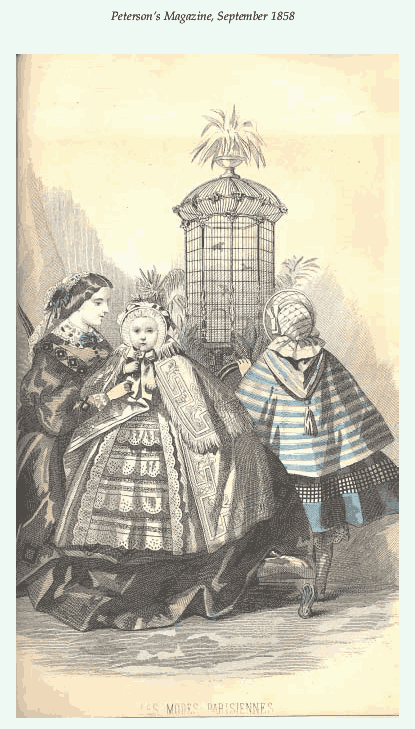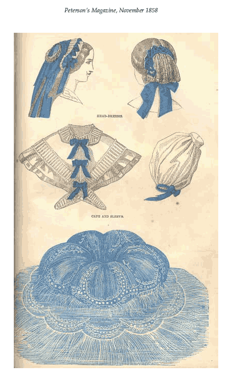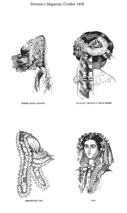 [costume and design pages], ---. Peterson's Magazine, Vol. 33, No. 10, October 1858, 7 pages. CD (LDA01). Posted November 6, 2002. SAMPLE PAGE. File size 1.8 MB PDF