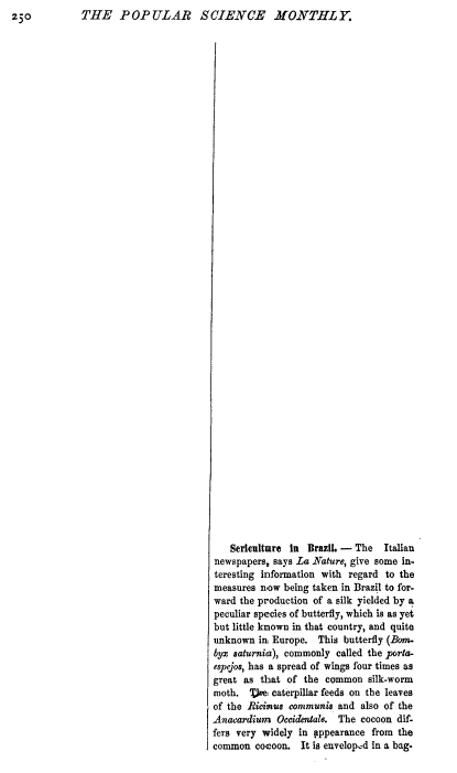 Sericulture in Brazil, ---. Popular Science Monthly, Vol. 4 (1873-1874), 2 pages. CD (HWDA09). Posted June 17, 2004. SAMPLE PAGE. File size 436 KB PDF