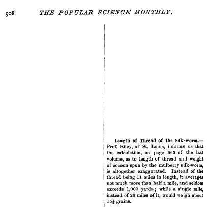 Length of Thread of the Silk-worm, ---. Popular Science Monthly, Vol. 4 (1873-1874), 1 page. CD (HWDA09). Posted June 17, 2004. SAMPLE PAGE. File size 400 KB PDF
