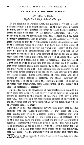 Textile Tests for High School, Tear, Julia F. School Science and Mathematics, Vol. 15 (1915), 3 pages.