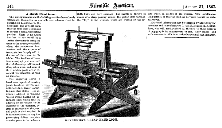A Simple Hand Loom, ---. Scientific American, Vol. 17 No. 9 (August 31, 1867), 1 page. Note: Reduced to 85% to fit on page. CD (HWDA08). Posted April 4, 2003. SAMPLE PAGE. File size 564 KB PDF