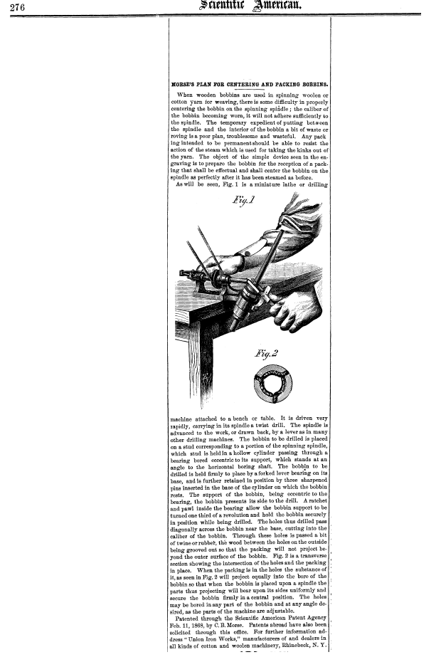 Morse's Plan for Centering and Packing Bobbins, ---. Scientific American, Vol. 18 No. 18 (May 2, 1868), 1 page. Note: Reduced to 85% to fit on page. CD (HWDA08). Posted April 4, 2003. SAMPLE PAGE. File size 516 KB PDF
