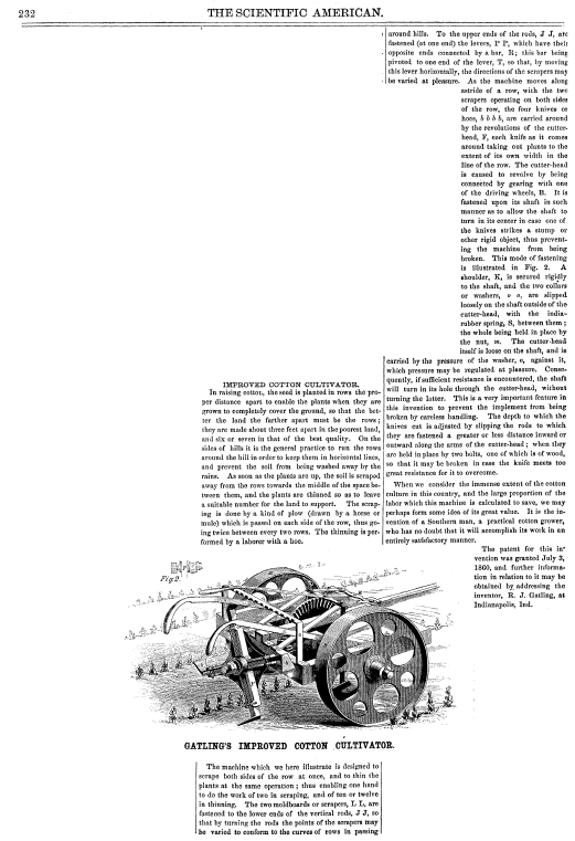 Gatling's Improved Cotton Cultivator, ---. Scientific American, Vol. 5, No. 15 (October 6, 1860), 1 page. Note: Reduced to 85% to fit on page. CD (HWDA08). Posted April 2, 2003. SAMPLE PAGE. File size 604 KB PDF