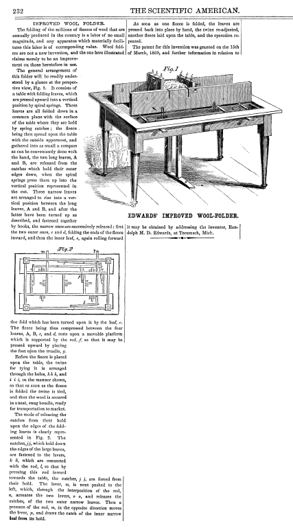 Edwards' Improved Wool-Folder, ---. Scientific American, Vol. 3, No. 15 (October 6, 1860), 1 page. Note: Reduced to 85% to fit on page. CD (HWDA08). Posted April 1, 2003. SAMPLE PAGE. File size 588 KB PDF