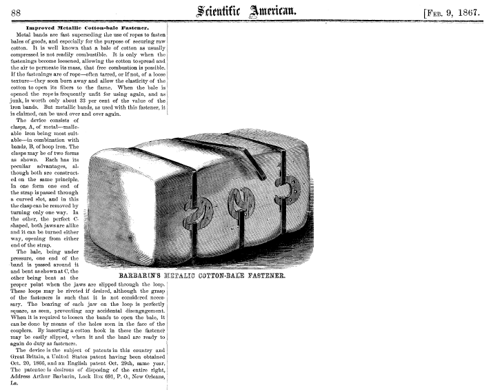 Improved Metallic Cotton-Bale Fastener, ---. Scientific American, Vol. 16 No. 6 (February 9, 1867), 1 page. Note: Reduced to 85% to fit on page. CD (HWDA08). Posted April 4, 2003. SAMPLE PAGE. File size 572 KB PDF