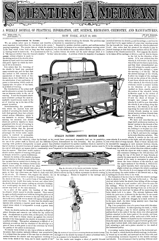 Improvement in Looms, ---. Scientific American, Vol. 21, No. 2 (July 10, 1869), 1 page. Note: Reduced to 75% to fit on page. CD (HWDA08). Posted April 4, 2003. SAMPLE PAGE. File size 920 KB PDF