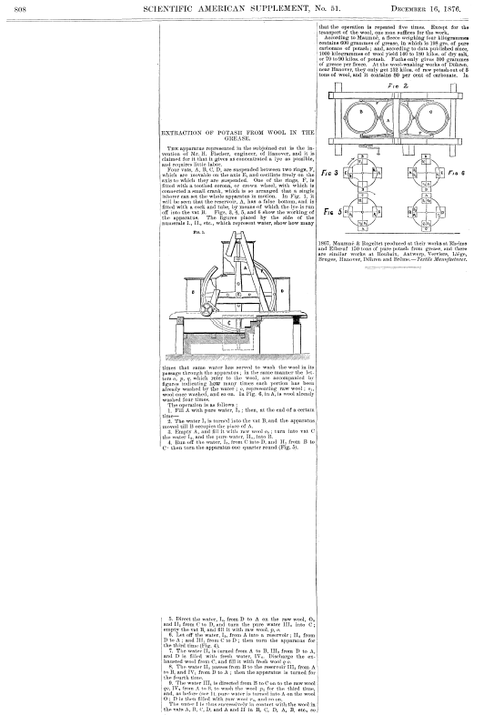 Extraction of Potash from Wool in the Grease, ---. Scientific American Supplement, Vol. 2, No. 51 (December 16, 1876), 1 page. Note: Reduced to 75% to fit on page. CD (HWDA08). Posted April 11, 2003. SAMPLE PAGE. File size 492 KB PDF
