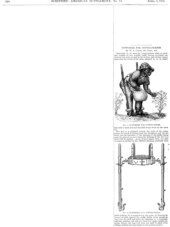 Supporter for Cotton-Pickers, ---. Scientific American Supplement, Vol. 1, No. 15 (April 8, 1876), 1 page. Note: Reduced to 85% to fit on page. CD (HWDA08). Posted April 11, 2003. SAMPLE PAGE. File size 488 KB PDF