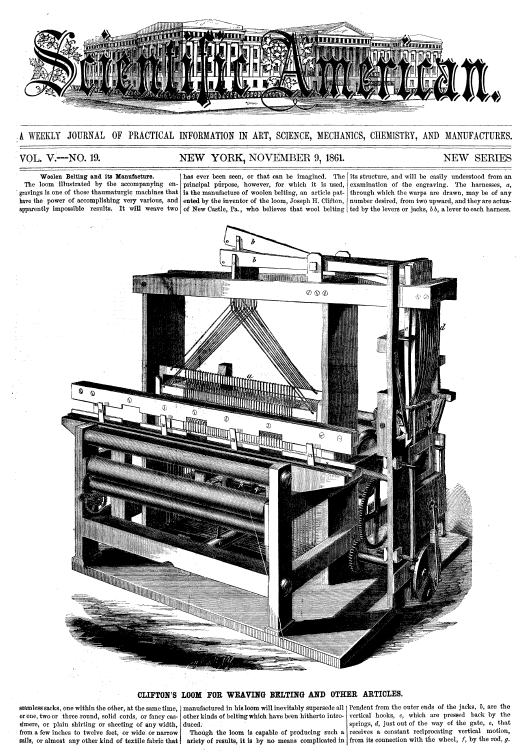 Woolen Belting and its Manufacture, ---. Scientific American, Vol. 5, No. 19 (November 9, 1861), 2 pages. Note: Reduced to 85% to fit on page. CD (HWDA08). Posted April 2, 2003. SAMPLE PAGE. File size 1 MB PDF