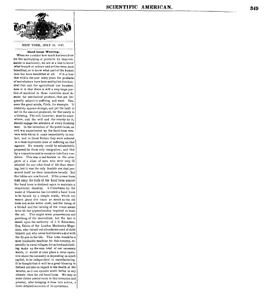 Newly Invented Loom, ---. Scientific American, Vol. 2, No. 46 (1847), 1 page. CD (HWDA12). Posted March 6, 2005. SAMPLE PAGE. File size 492 KB PDF