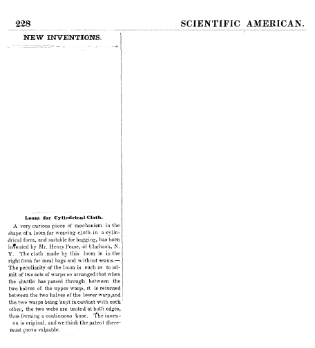 Loom for Cylindrical Cloth, ---. Scientific American, Vol. 2, No. 29 (1847), 1 page. CD (HWDA12). Posted March 6, 2005. SAMPLE PAGE. File size 428 KB PDF
