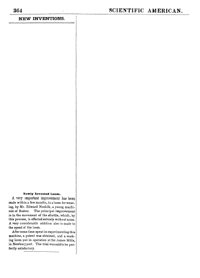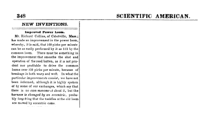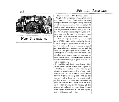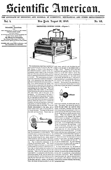 Improvement in the Power Loom, ---. Scientific American, Vol. 3, No. 19 (1848), 1 page. CD (HWDA12). Posted March 6, 2005. SAMPLE PAGE. File size 488 KB PDF