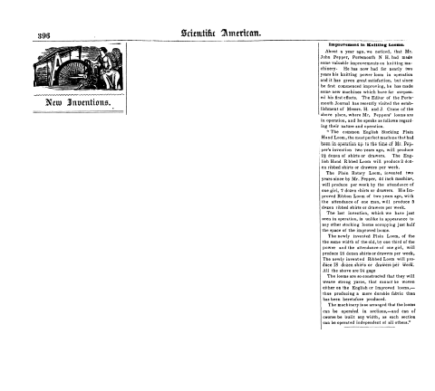 Improvement in Knitting Looms, ---. Scientific American, Vol. 4, No. 50 (1849), 1 page. CD (HWDA12). Posted March 6, 2005. SAMPLE PAGE. File size 660 KB PDF