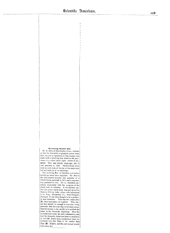 Revolving Shuttle Box, ---. Scientific American, Vol. 3, No. 19 (1848), 1 page. CD (HWDA12). Posted March 6, 2005. SAMPLE PAGE. File size 472 KB PDF