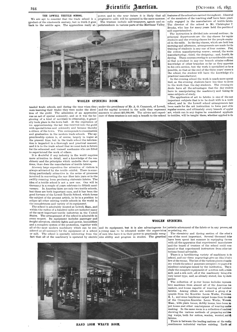 Lowell Textile School, ---. Scientific American, October 16, 1897, 1 page. Note: Reduced to 70% to fit on page. CD (HWDA08). Posted February 17, 2004. SAMPLE PAGE. File size 892 KB PDF