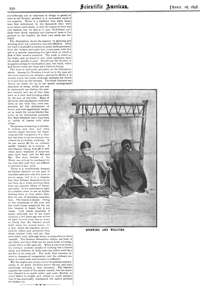 Pueblo Arts and Industries -- II, Mindeleff, Cosmos. Scientific American, April 16, 1898, 2 pages. Note: Reduced to 70% to fit on page. CD (HWDA08). Posted February 17, 2004. SAMPLE PAGE. File size 1 MB PDF