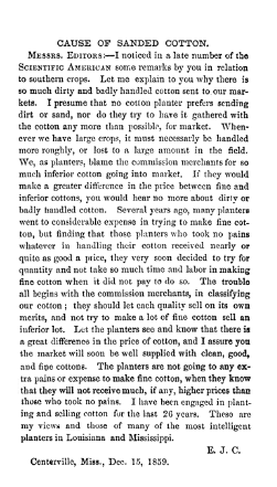 Cause of Sanded Cotton, ---. Scientific American, 1859, 1 page. CD (HWDA07). Posted December 19, 2003. SAMPLE PAGE. File size 576 KB PDF