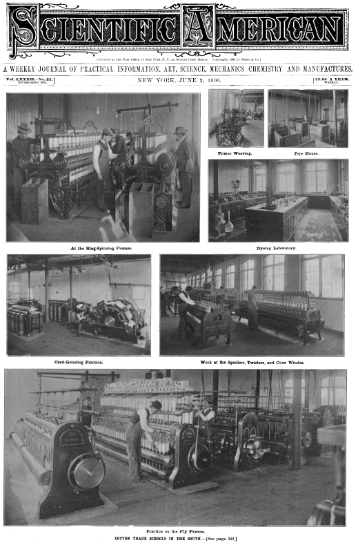 Cotton Trade Schools in the South, Stewart, J. A. Scientific American, June 2, 1900, 2 pages. Note: Reduced to 73% to fit on page. Posted February 4, 2003. SAMPLE PAGE. File size 1.1 MB PDF