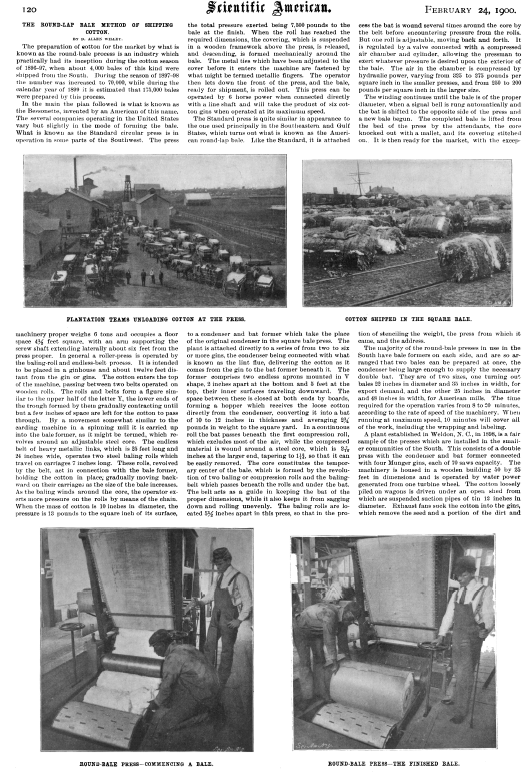 Round-Lap Method for Shipping Cotton, Willey, D. Allen. Scientific American, February 24, 1900, 2 pages. Note: Reduced to 73% to fit on page. Posted February 5, 2003. SAMPLE PAGE. File size 1.4 MB PDF