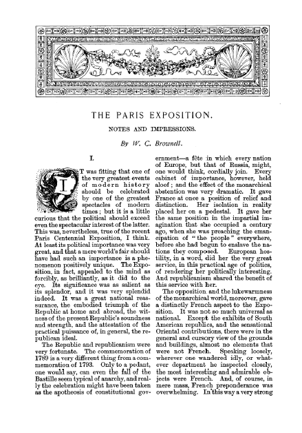 Paris Exposition: Notes and Impressions, Browbell, W. C. Scribner's Magazine, Vol. 7, No. 1 (January 1890), 18 pages. CD (HWDA11). Posted October 6, 2004. SAMPLE PAGE. File size 6.3 MB PDF