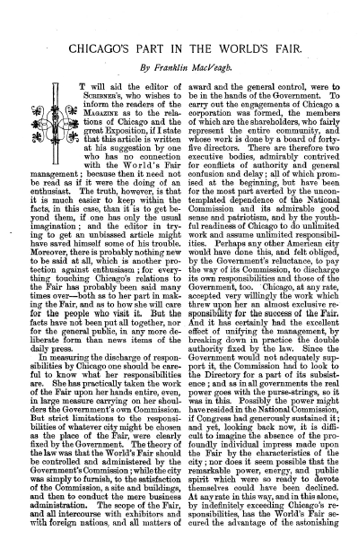 Chicago's Part in the World's Fair, MacVeigh, Franklin. Scribner's Magazine, Vol. 12, No. 5 (November 1892), 7 pages. CD (HWDA12). Posted January 17, 2005. SAMPLE PAGE. File size 3,2 MB PDF