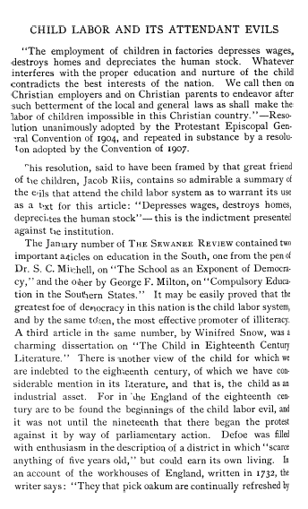 Child Labor and its Attendant Evils, McKelway, A. J. Sewanee Review, Vol. 16 (1908), 14 pages.