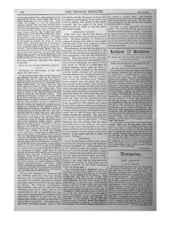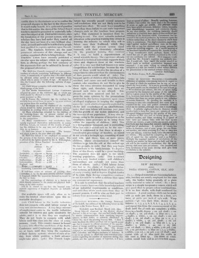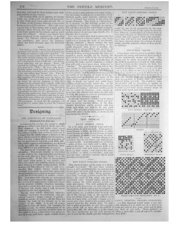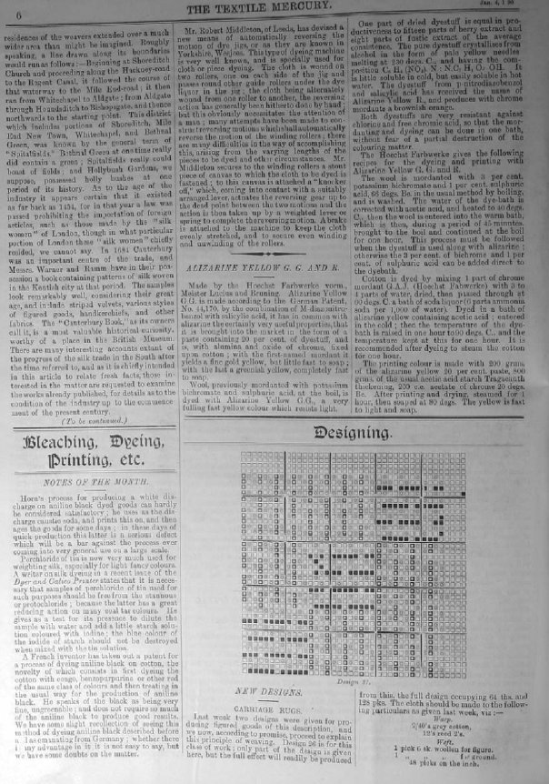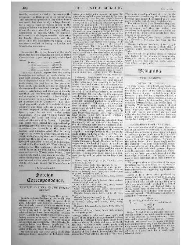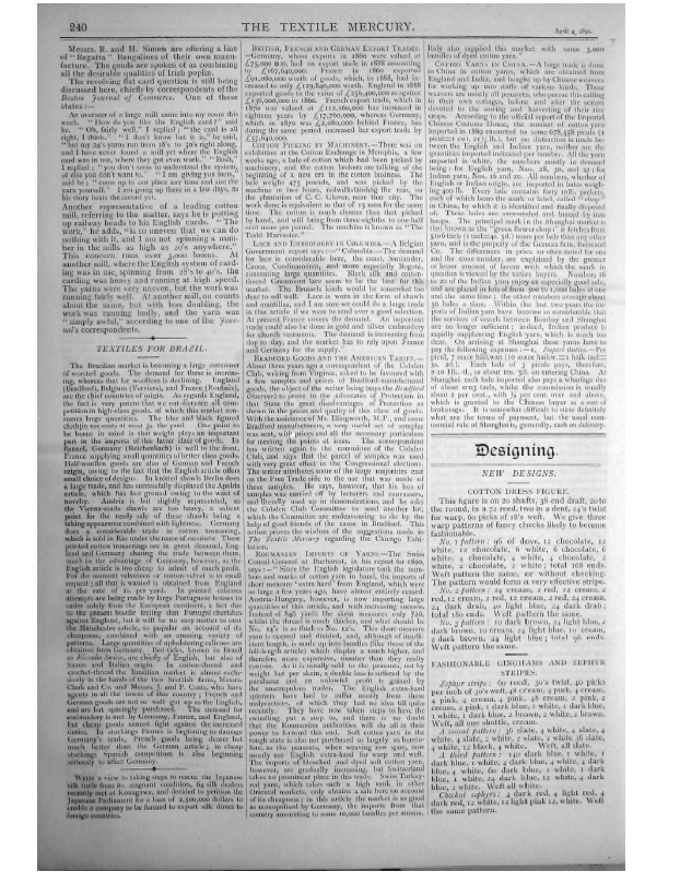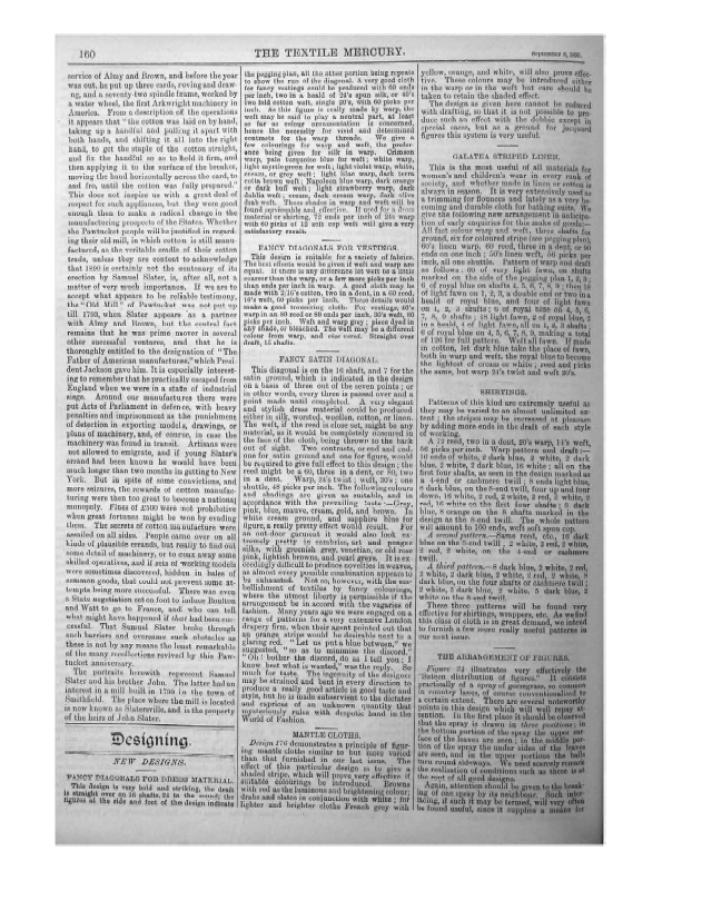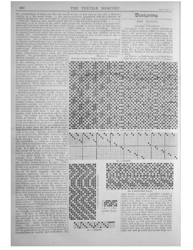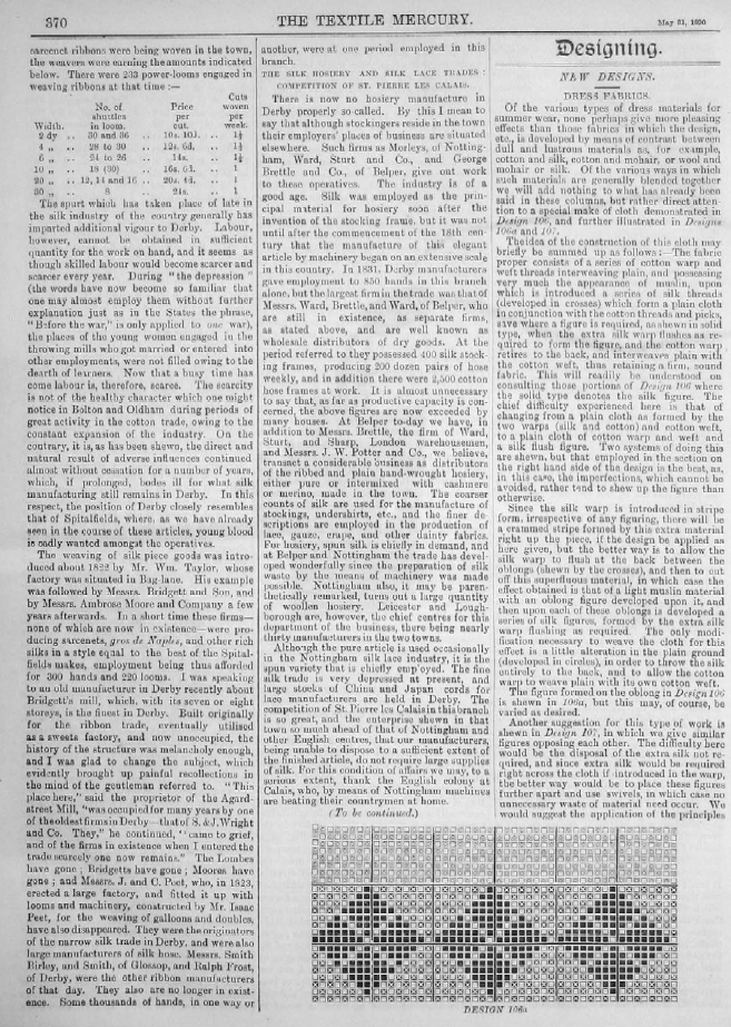 Designing, ---. Textile Mercury, August 16, 1890, 2 pages. Note: Digital photography. Posted September 10, 2006. SAMPLE PAGE. File size 455 KB PDF
