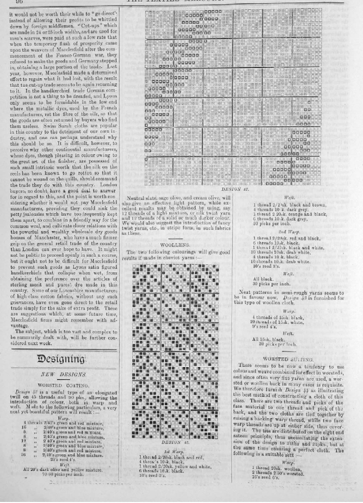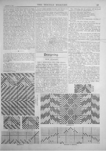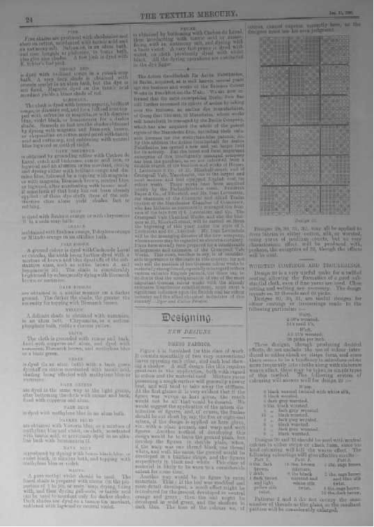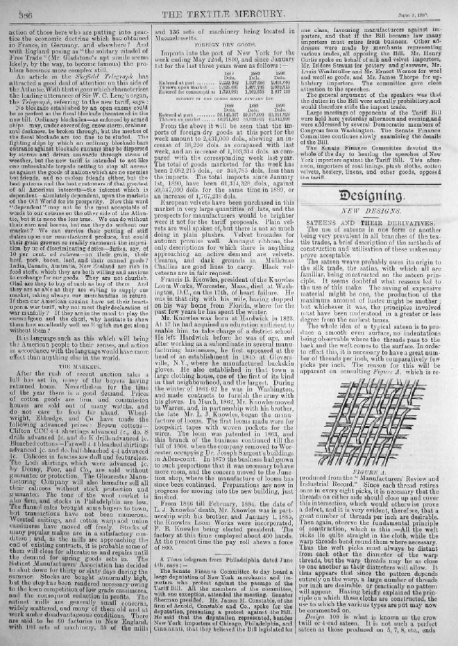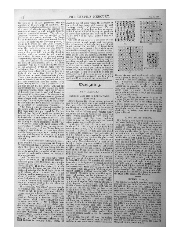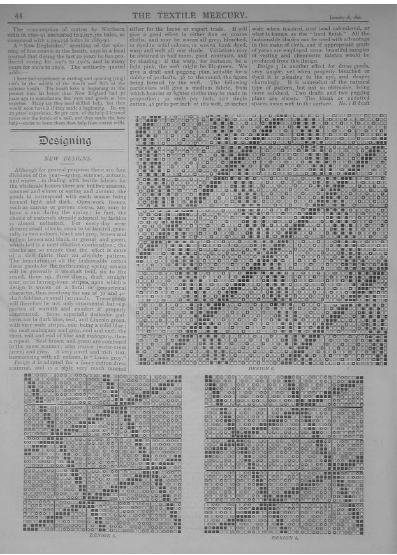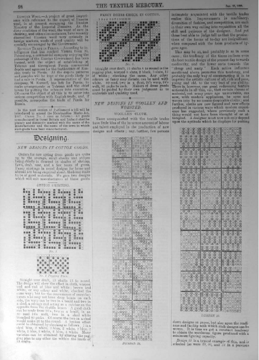 Designing, ---. Textile Mercury, July 5, 1890, 2 pages. Note: Digital photography. Posted September 19, 2006. SAMPLE PAGE. File size 510 KB PDF