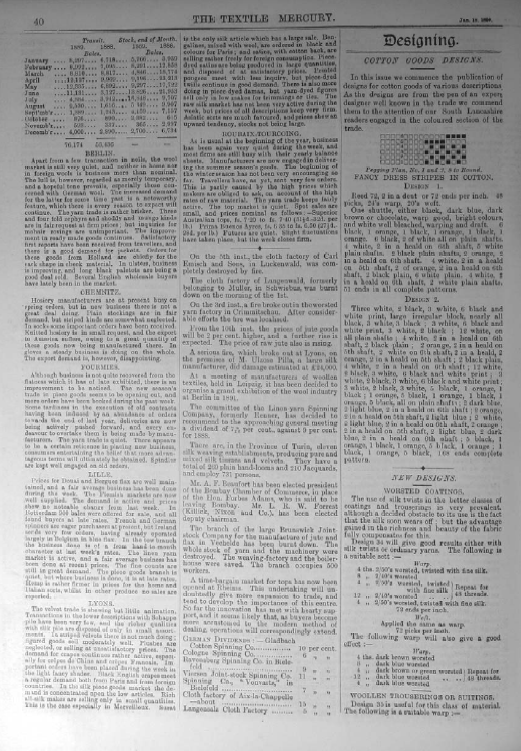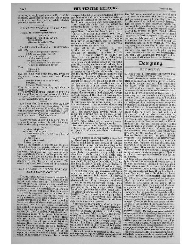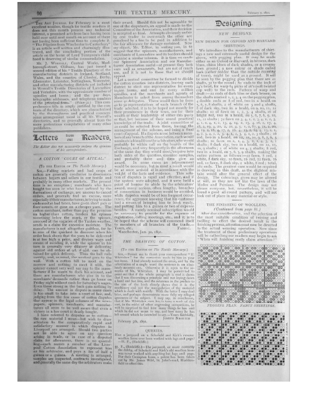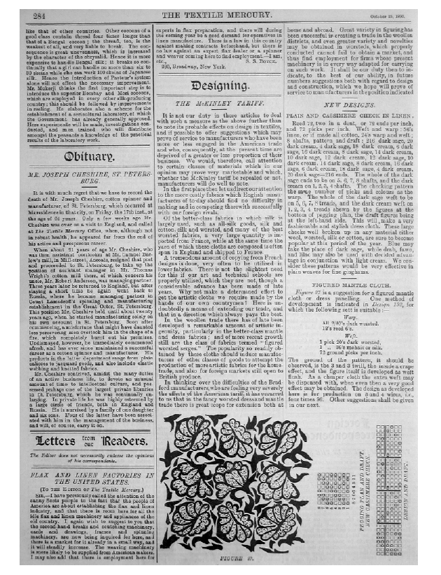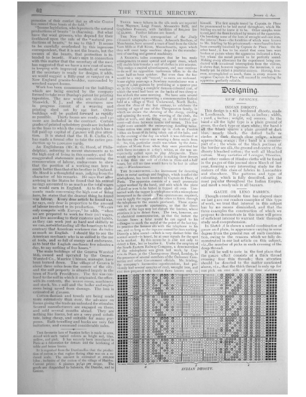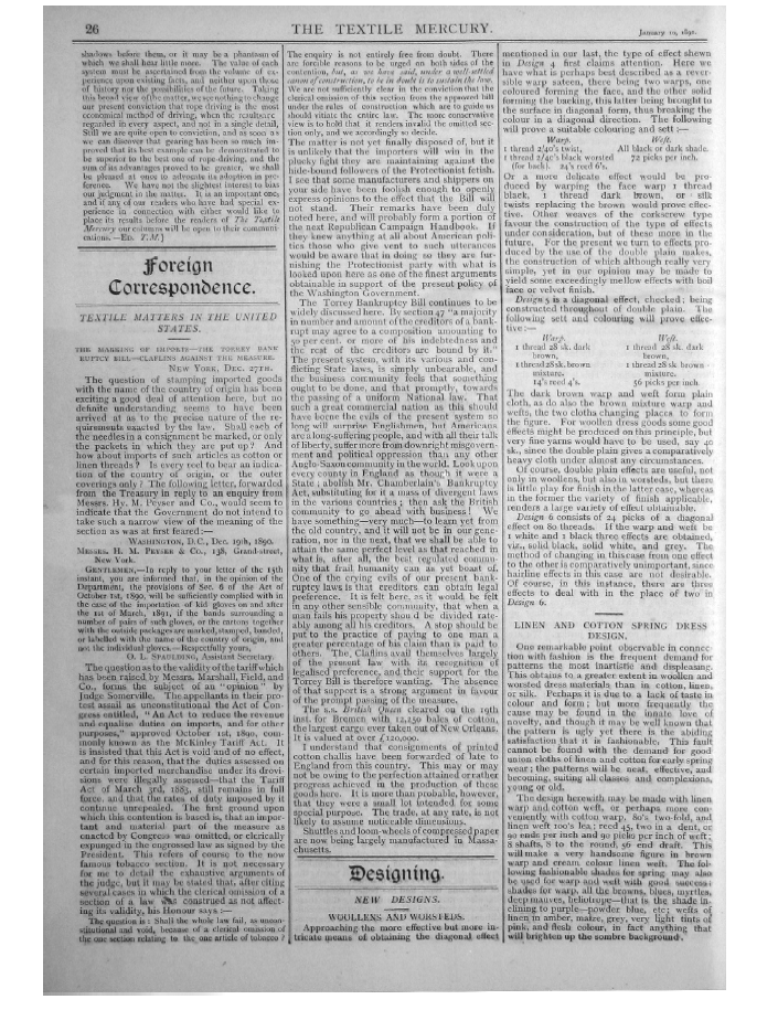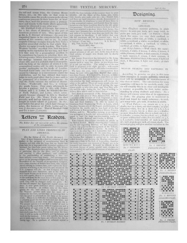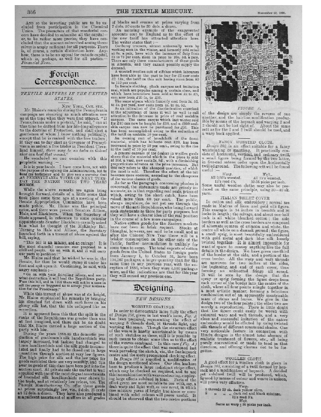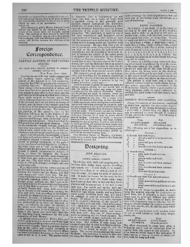 Designing, ---. Textile Mercury, October 4, 1890, 2 pages. Note: Digital photography. Posted September 10, 2006. SAMPLE PAGE. File size 1.43 MB PDF