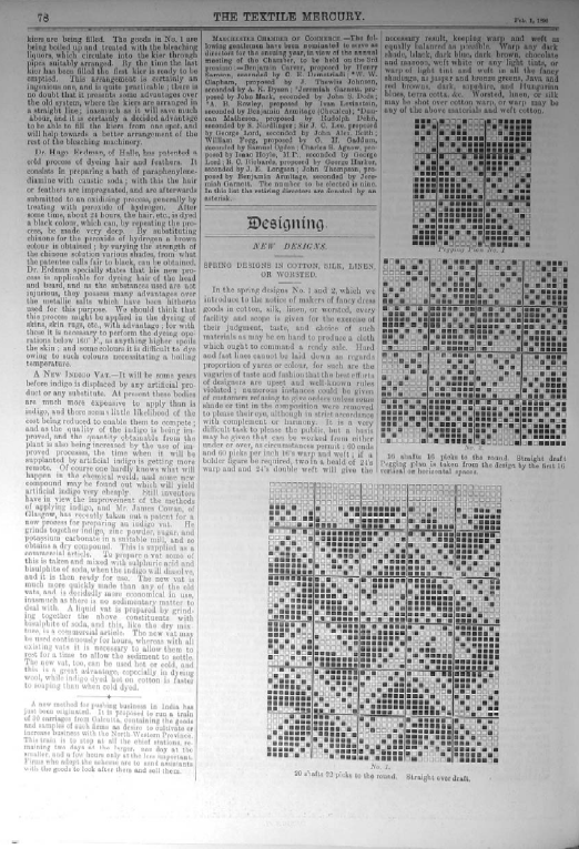 Designing, ---. Textile Mercury , Vol. 6 (1892), 2 pages. Note: Digital photography. Posted August 22, 2006. SAMPLE PAGE. File size 709 KB PDF