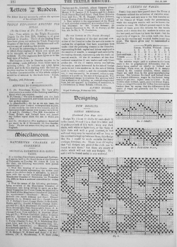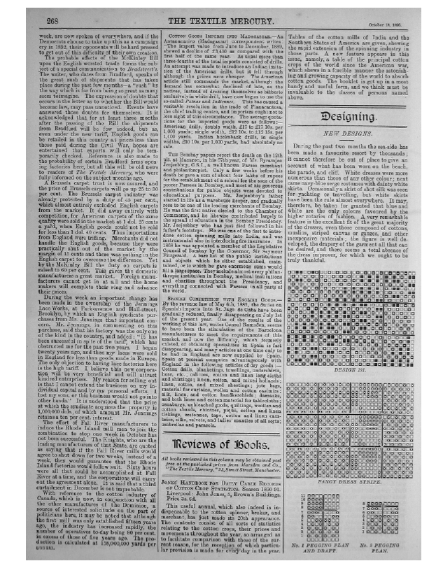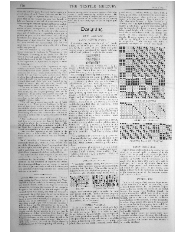 Designing, ---. Textile Mercury , Vol. 6 (1892), 2 pages. Note: Digital photography. Posted August 22, 2006. SAMPLE PAGE. File size 621 KB PDF