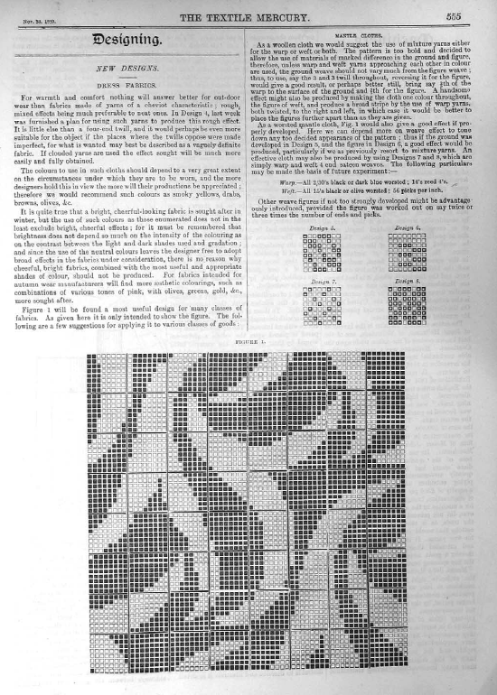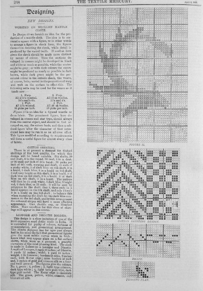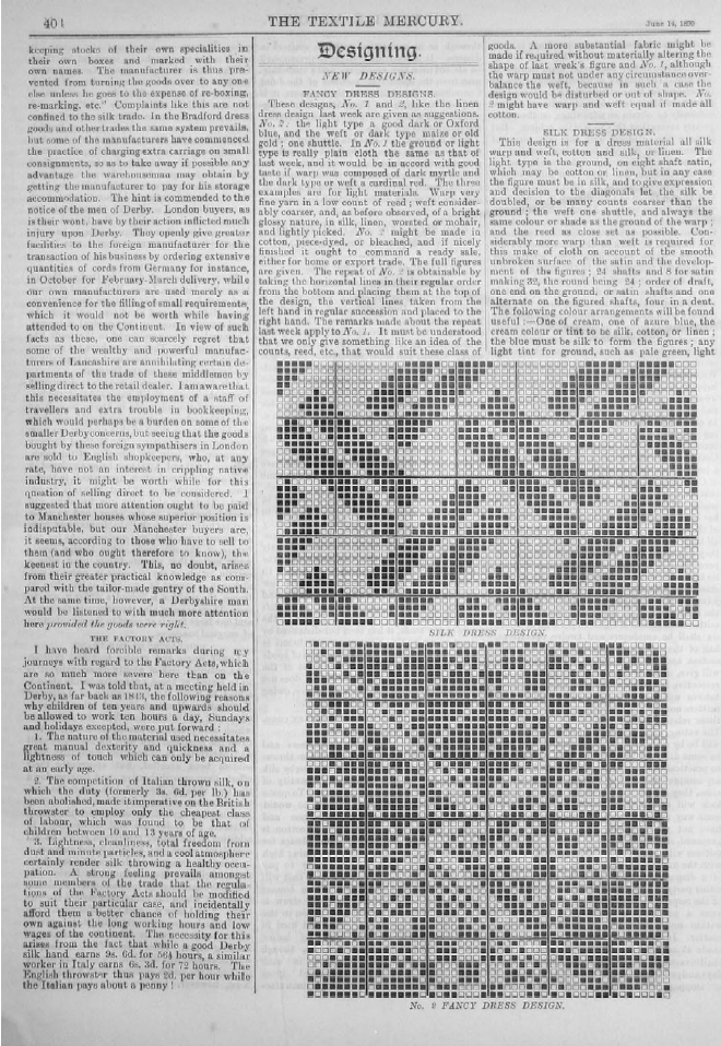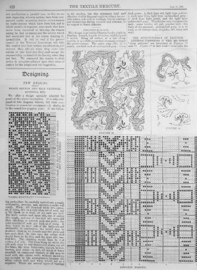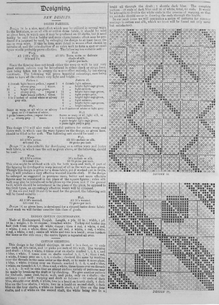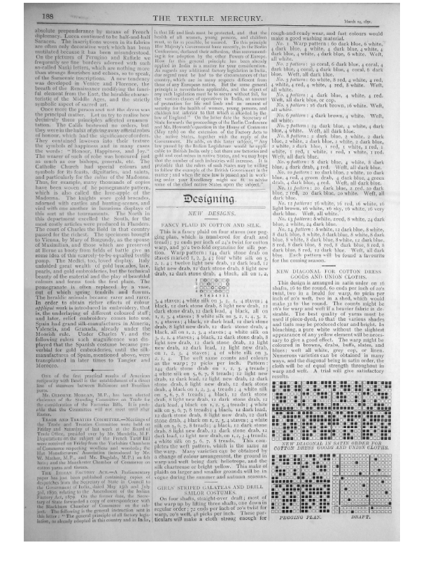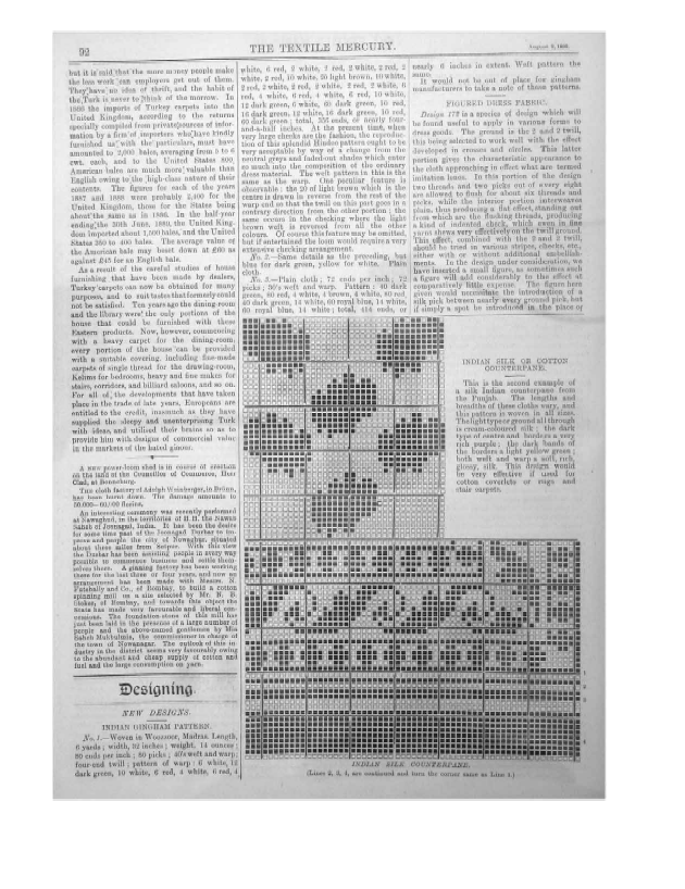 Designing, ---. Textile Mercury , Vol. 6 (1892), 2 pages. Note: Digital photography. Posted August 22, 2006. SAMPLE PAGE. File size 619 KB PDF