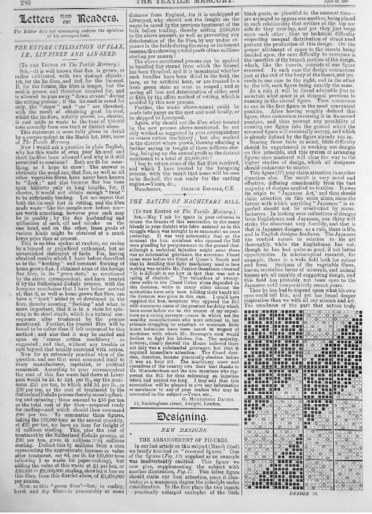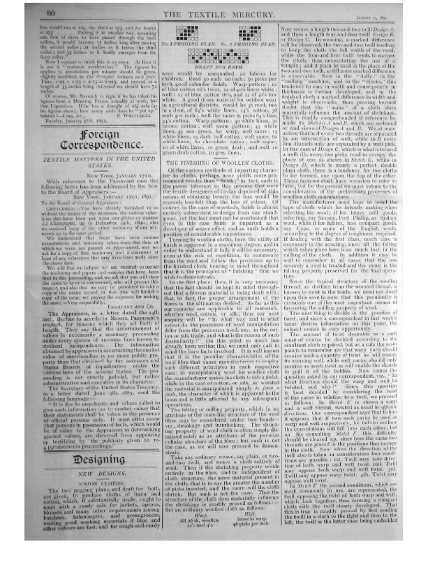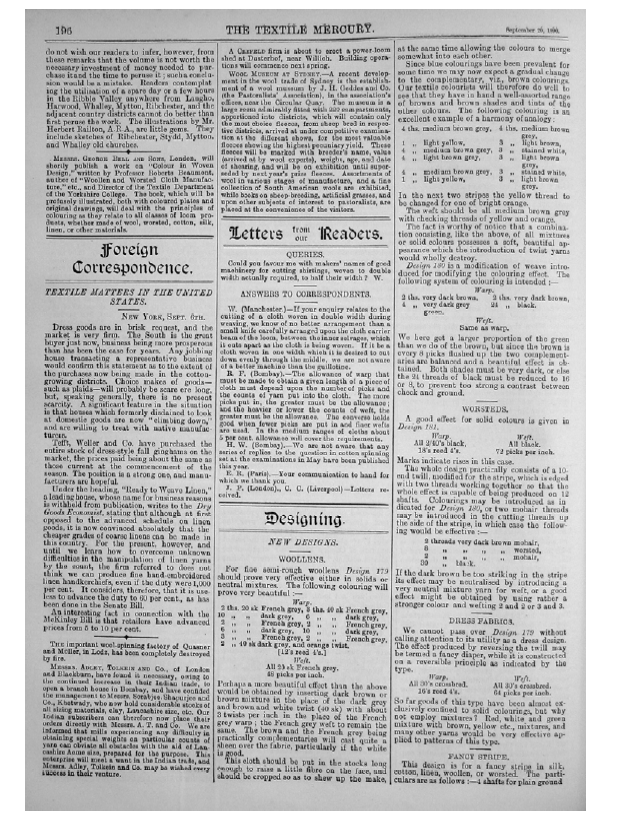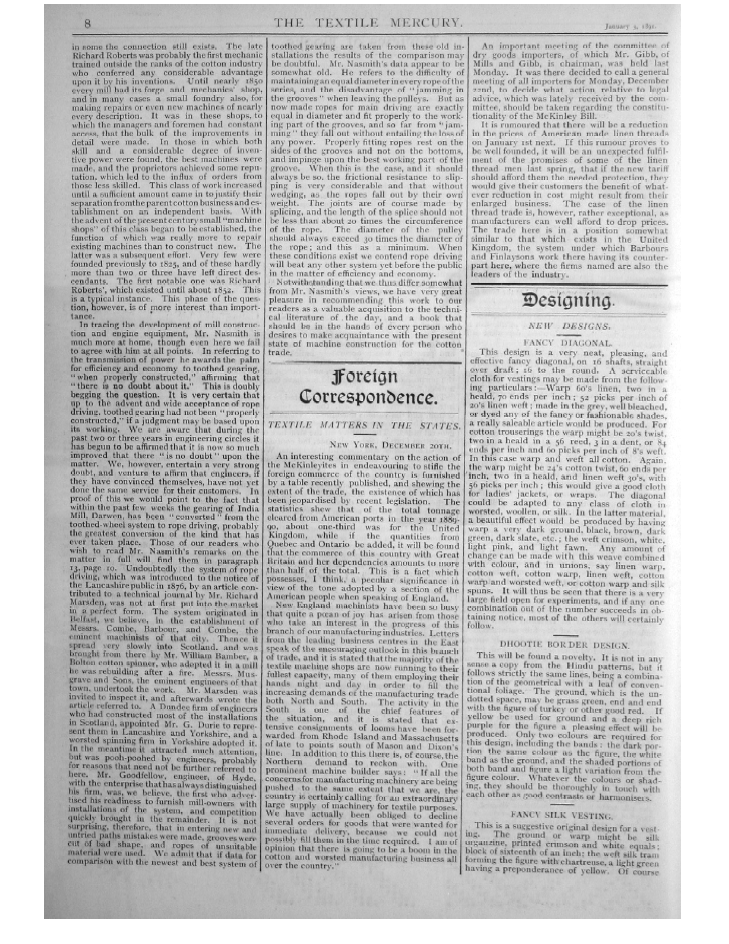 Designing, ---. Textile Mercury, August 30, 1890, 2 pages. Note: Digital photography. Posted September 10, 2006. SAMPLE PAGE. File size 534 KB PDF