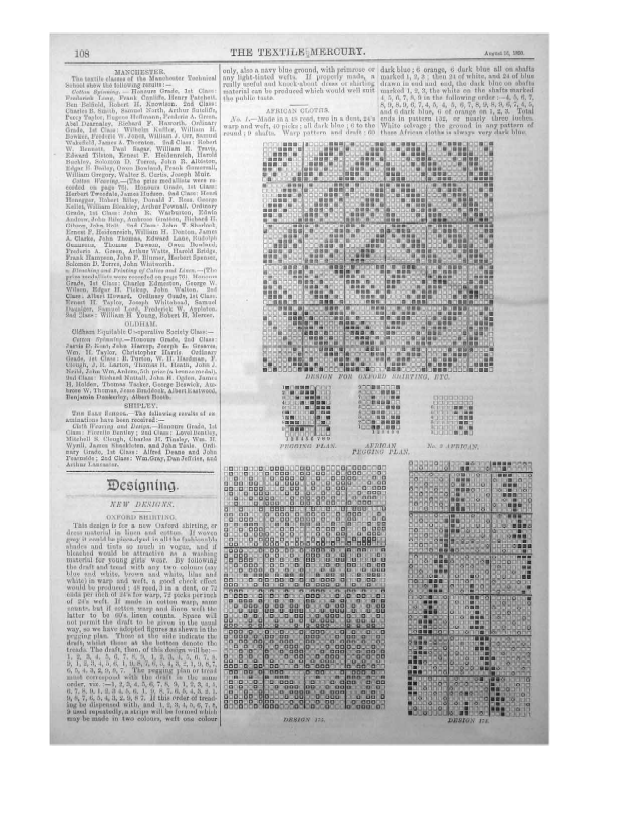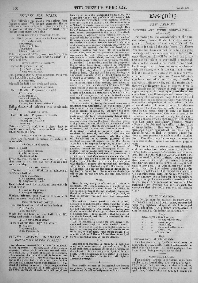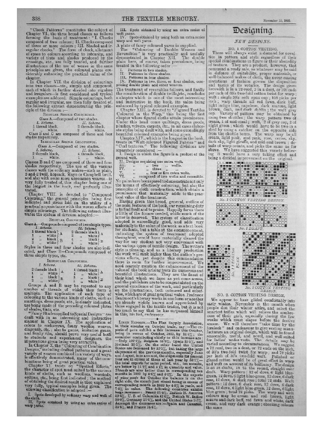 Designing, ---. Textile Mercury , Vol. 6 (1892), 2 pages. Note: Digital photography. Posted August 22, 2006. SAMPLE PAGE. File size 4.65 MB PDF