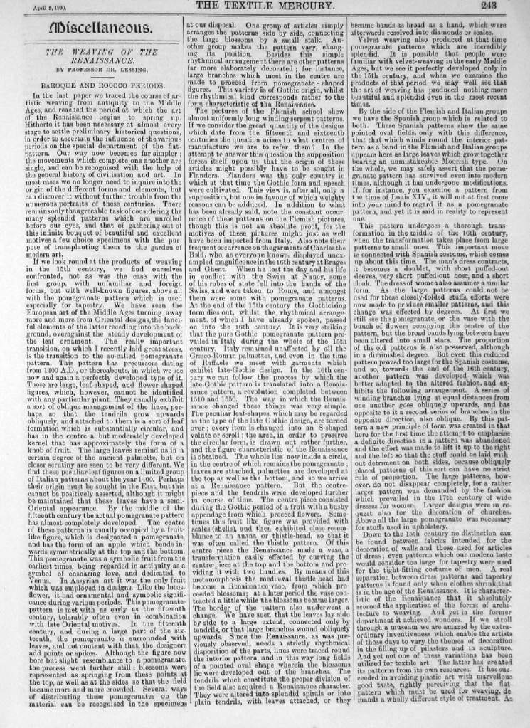 The Weaving of the Renaissance, Lessing. Textile Mercury , Vol. 2 (1890), 2 pages. Note: Digital photography. Posted July 8, 2006. SAMPLE PAGE. File size 978 KB PDF