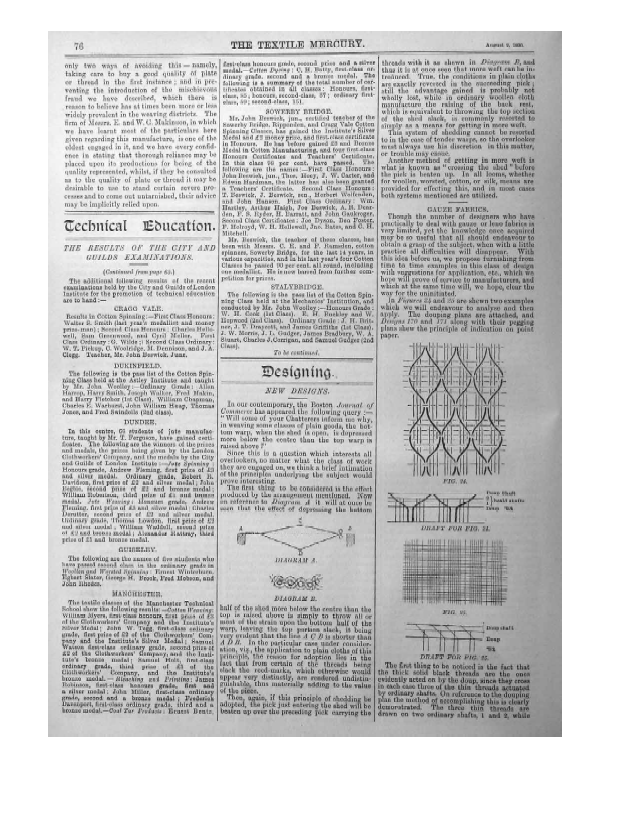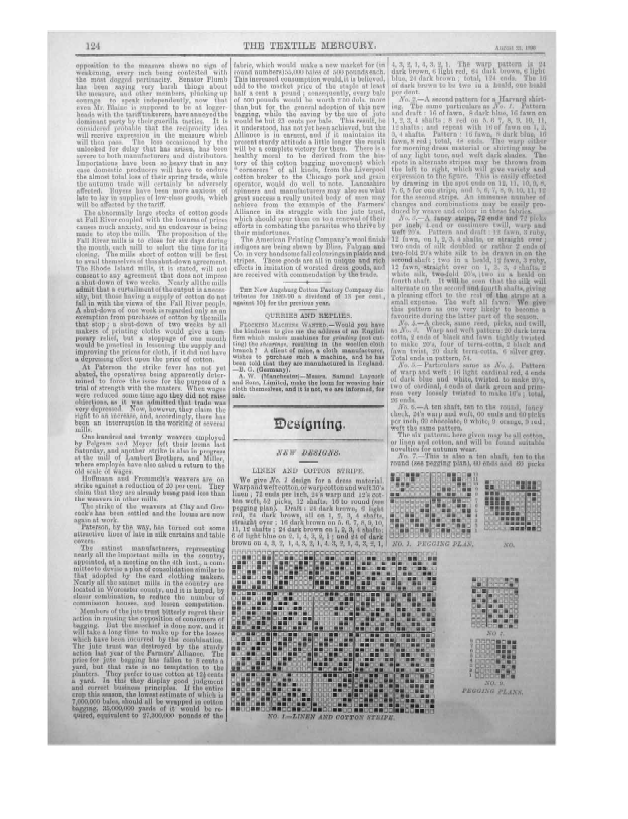 Designing, ---. Textile Mercury, August 23, 1890, 2 pages. Note: Digital photography. Posted September 10, 2006. SAMPLE PAGE. File size 452 KB PDF