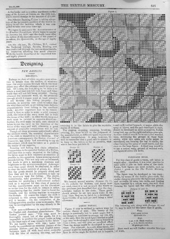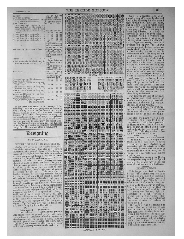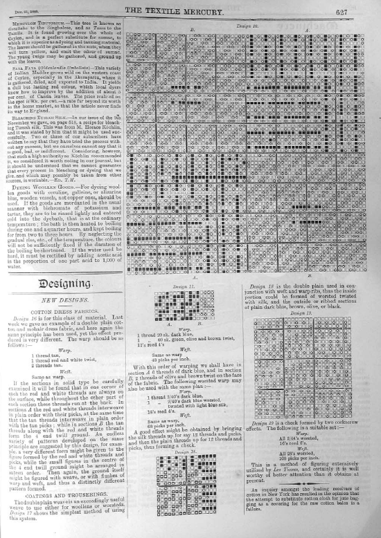 Designing, ---. Textile Mercury , Vol. 6 (1892), 2 pages. Note: Digital photography. Posted August 22, 2006. SAMPLE PAGE. File size 685 KB PDF